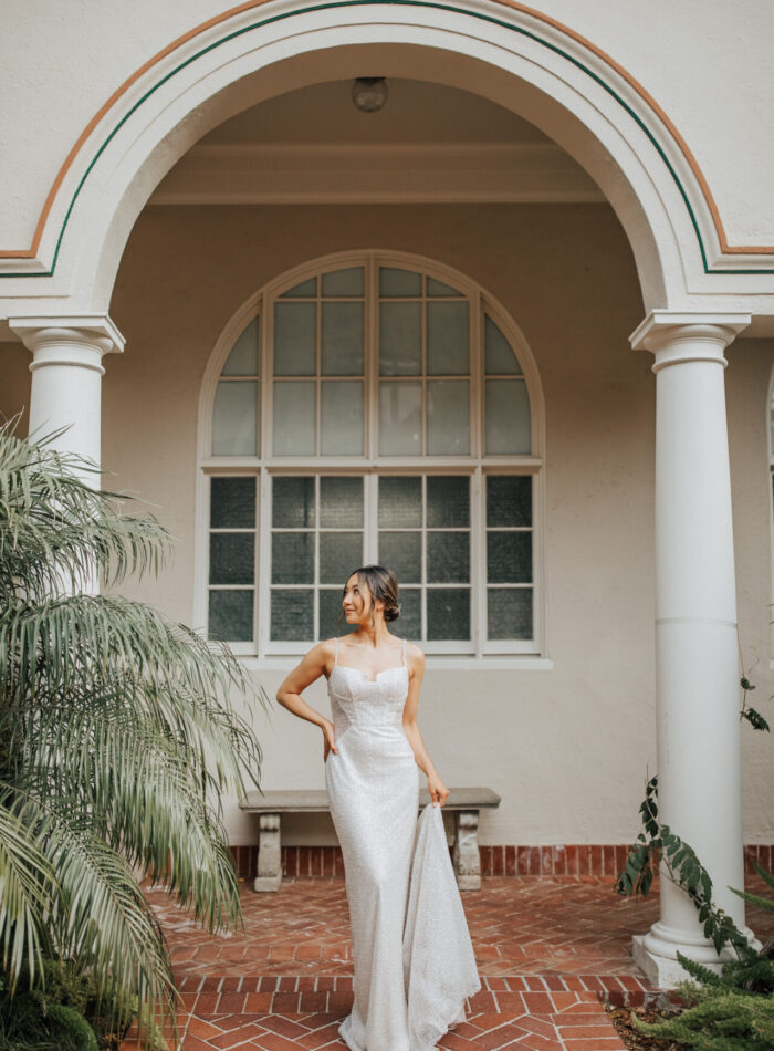 An allover sparkle masterpiece, "Penelope" By Essense of Australia takes center stage with a modern take on an old Hollywood wedding gown. Sleek spaghetti straps shimmer with silver beads and attach to a modern corset bodice with a chic notch neckline. Sheer side cutouts provide a sultry touch before giving way to a dramatic low illusion back, opulently studded in shimmering beads with clear buttons lining the center back. Equal parts decadent and refined, this luxe art deco-inspired bridal gown makes a striking statement. For the bride who wants to shine down the aisle, this sexy wedding dress makes an unforgettable entrance.