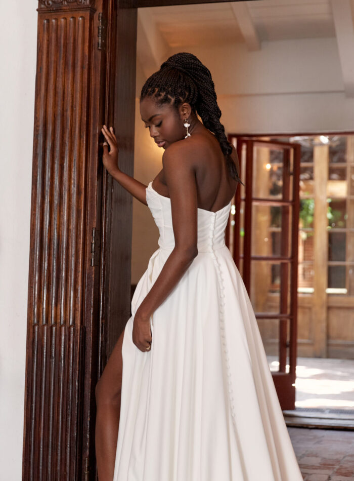 Minimalist elegance shines in the "Rainer" gown by Essense of Australia, a sleek strapless plus size wedding dress inspired by ancient Greek goddesses. With its chic design, the lined bodice drapes gracefully over the figure, meeting a timeless A-line skirt that softly flows over the hips, opening into an striking leg slit for effortless movement and grace. This draped wedding gown offers a stunning blend of simplicity and sophistication for an elegant bridal look. Available in sizes 7-36 in Ivory or White.